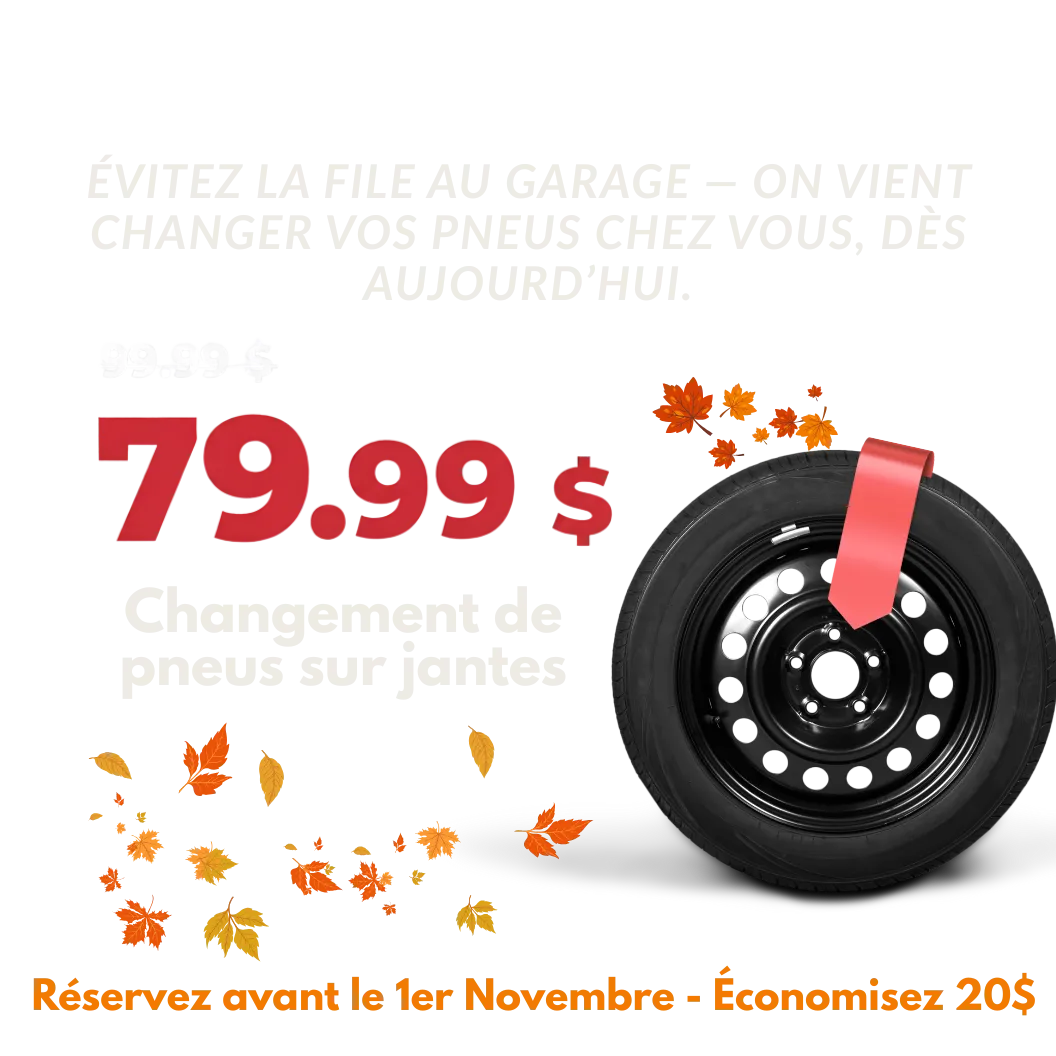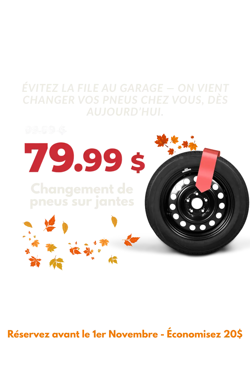 -Changement de pneus sur jantes : 79,99 $ (rabais de 20 $ avant le 1er novembre)